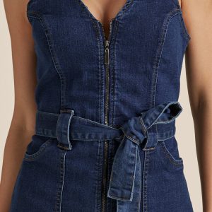 Your favorite denim now comes in a trendy low-cut dress that zips up the front for a simple getting-ready routine. Narrow double straps at both shoulders and a self-tie belt turn up the heat on this classic wear-anywhere style finished with a front slit and patch pockets to hold all your essentials.* Functional pockets and self tie at waist* Exposed functional zipper at front * Denim dress * Hits at the knee 40’* Fabric has some stretch* Cotton/poly/spandex. Imported