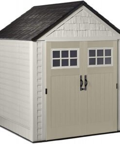 Rubbermaid 7×7 Ft Durable Weather Resistant Resin Outdoor Garden Storage Shed with Windows and Utility Hooks, Sand